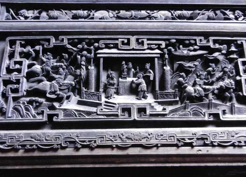 石雕、木雕、磚雕作為徽州三雕源于宋代,到明清達到極盛,三雕在徽派建筑的各個部分主要是門樓、門罩、梁架、窗柩、欄桿等處進行裝飾,是徽派建筑長期使用的一種裝飾手法。在構圖布局上,徽州三雕吸收了新安畫派的表現(xiàn)手法,講究藝術美,多用深浮雕和圓雕,提倡鏤空效果,有的鏤空層次多達10余層,亭臺樓榭、樹木山水、蟲魚鳥獸等都集中在同一幅畫面上,層次分明,栩栩如生。